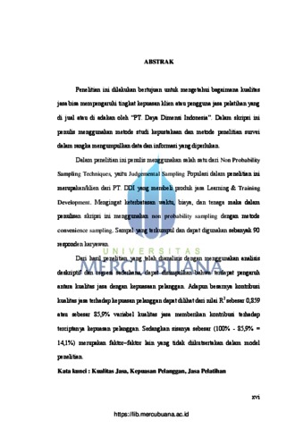 Penelitian ini dilakukan bertujuan untuk mengetahui bagaimana kualitas jasa bisa mempengaruhi tingkat kepuasan klien atau pengguna jasa pelatihan yang di jual atau di adakan oleh “PT. Daya Dimensi Indonesia”. Dalam skripsi ini penulis menggunakan metode studi kepustakaan dan metode penelitian survei dalam rangka mengumpulkan data dan informasi yang diperlukan. Dalam penelitian ini penulis menggunakan salah satu dari Non Probability Sampling Techniques, yaitu Judgemental Sampling Populasi dalam penelitian ini merupakan/klien dari PT. DDI yang membeli produk jasa Learning & Training Development. Mengingat keterbatasan waktu, biaya, dan tenaga maka dalam penulisan skripsi ini menggunakan non probability sampling dengan metode convenience sampling. Sampel yang terkumpul dan dapat digunakan sebanyak 90 responden karyawan. Dari hasil penelitian yang telah dianalisis dengan menggunakan analisis deskriptif dan regresi sederhana, dapat disimpulkan bahwa terdapat pengaruh antara kualitas jasa dengan kepuasaan pelanggan. Adapun besarnya kontribusi kualitas jasa terhadap kepuasan pelanggan dapat dilihat dari nilai R2 sebesar 0,859 atau sebesar 85,9% variabel kualitas jasa memberikan kontribusi terhadap terciptanya kepuasan pelanggan. Sedangkan sisanya sebesar (100% - 85,9% = 14,1%) merupakan faktor–faktor lain yang tidak diikutsertakan dalam model penelitian. Kata kunci : Kualitas Jasa, Kepuasan Pelanggan, Jasa Pelatihan