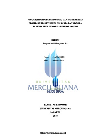 Hariyanto, Hariyanto (2010) PENGARUH PERPUTARAN PIUTANG DAN KAS TERHADAP PROFIBILITAS PT.DELTA DJAKARTA DAN MAYORA DI BURSA EFEK INDONESIA PERIODE 2005-2009. S1 thesis, Universitas Mercu Buana.