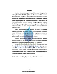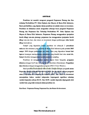 Penelitian ini meneliti mengenai pengaruh Perputaran Piutang dan Kas terhadap Profitabilitas PT. Delta Djakarta dan Mayora di Bursa Efek Indonesia. Rasio profitabilitas yang dipakai dalam penelitian ini adalah return on investmen. Penelitian ini dilakukan untuk mengetahui seberapa besar pengaruh Perputaran Piutang dan Perputaran Kas Terhadap Profitabilitas PT. Delta Djakarta dan Mayora di Bursa Efek Indonesia. Perputaran Piutang menggunakan (penjualan bersih dibagi rata-rata piutang), perputaran kas menggunakan (penjualan bersih dibagi rata-rata kas), dan return on investment dengan perhitungan (laba bersih dibagi total aktiva). Sampel yang digunakan dalam penelitian ini sebanyak 2 perusahaan makanan dan minuman yang terdaftar di Bursa Efek Indonesia pada periode 2005 sampai 2009 dengan perhitungan per tahun. Data yang digunakan berasal dari laporan keuangan masing-masing perusahaan yang diambil dari situs resmi idx. Sampel diseleksi menggunakan metode purposive sampling. Penelitian ini menggunakan analisis regresi linier berganda, pengujian dilakukan dengan Uji F dan Uji t dan Uji R2 (Koefisien Determinan). Pengolahan data dilakukan dengan menggunakan program SPSS 17.0 for Windows. Hasil penelitian menunjukan bahwa tidak terdapat terdapat pengaruh antara Perputaran Piutang terhadap Profitabilitas (ROI), dan juga tidak terdapat pengaruh antara Perputaran Kas terhadap Profitabilitas (ROI). Dan koefisien determinasi menunjukkan bahwa variabel independen berpengaruh signifikan terhadap variabel dependen sebesar 89,1%. Dan 10,9% variabel dependen dipengaruhi oleh variabel lain yang tidak termasuk dalam penelitian ini. Kata Kunci : Perputaran Piutang, Perputaran Kas, dan Return On Investment.