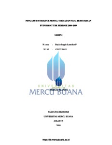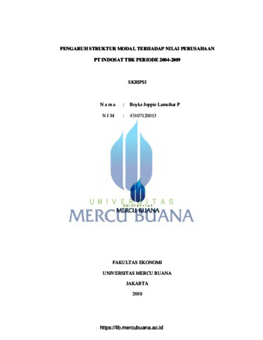 PAKPAHAN, BOYKE JOPPIE LAMSIHAR (2010) PENGARUH STRUKTUR MODAL TERHADAP NILAI PERUSAHAAN PT INDOSAT TBK PERIODE 2004-2009. S1 thesis, Universitas Mercu Buana.