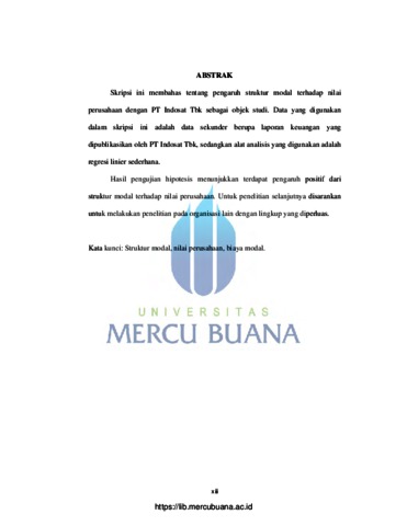 Skripsi ini membahas tentang pengaruh struktur modal terhadap nilai perusahaan dengan PT Indosat Tbk sebagai objek studi. Data yang digunakan dalam skripsi ini adalah data sekunder berupa laporan keuangan yang dipublikasikan oleh PT Indosat Tbk, sedangkan alat analisis yang digunakan adalah regresi linier sederhana. Hasil pengujian hipotesis menunjukkan terdapat pengaruh positif dari struktur modal terhadap nilai perusahaan. Untuk penelitian selanjutnya disarankan untuk melakukan penelitian pada organisasi lain dengan lingkup yang diperluas. Kata kunci: Struktur modal, nilai perusahaan, biaya modal.