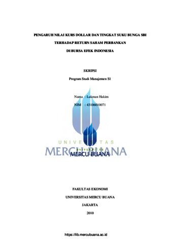 Hakim, Lukman (2010) PENGARUH NILAI KURS DOLLAR DAN TINGKAT SUKU BUNGA SBI TERHADAP RETURN SAHAM PERBANKAN DI BURSA EFEK INDONESIA. S1 thesis, Universitas Mercu Buana.