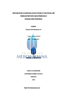 | Uncontrolled Keywords: | Return Saham, Nilai Kurs Dollar, Tingkat Suku Bunga Indonesia (SBI). |