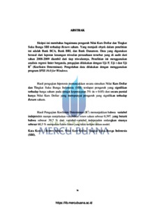 Skripsi ini membahas bagaimana pengaruh Nilai Kurs Dollar dan Tingkat Suku Bunga SBI terhadap Return saham. Yang menjadi obyek dalam penelitian ini adalah Bank BCA, Bank BRI, dan Bank Danamon. Data yang digunakan berasal dari laporan keuangan triwulan perusahaan tersebut yang di audit dari tahun 2008-2009 diambil dari tiap triwulannya, Penelitian ini menggunakan analisis regresi linier berganda, pengujian dilakukan dengan Uji F, Uji t dan Uji R2 (Koefisien Determinan). Pengolahan data dilakukan dengan menggunakan program SPSS 16.0 for Windows. Hasil pengujian hipotesis menunjukkan secara simultan Nilai Kurs Dollar dan Tingkat Suku Bunga Indonesia (SBI) terdapat pengaruh yang signifikan terhadap harga saham pada derajat kepercayaan 5% (α = 0.05) dan secara parsial hanya Nilai Kurs Dollar yang mempunyai pengaruh yang signifikan terhadap Return saham. Hasil Pengujian Koefisien Determinan (R2 ) menunjukkan bahwa variabel independen mampu menjelaskan variabilitas return saham sebesar 0,397. yang berarti bahwa sebesar 39,7 % dari variabel-variabel independen sedangkan sisanya sebesar 60,3 % merupakan faktor-faktor yang tidak terliput dalam model. Kata Kunci : Return Saham, Nilai Kurs Dollar, Tingkat Suku Bunga Indonesia (SBI).