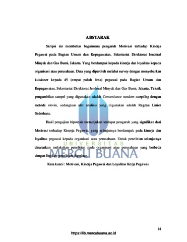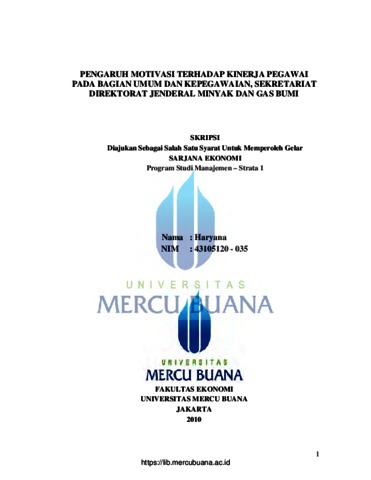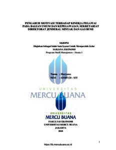 Haryana, Haryana (2010) PENGARUH MOTIVASI TERHADAP KINERJA PEGAWAI PADA BAGIAN UMUM DA KEPEGAWAIAN, SEKRETARIAT, DIREKTORAT JENDERAL MINYAK DAN GAS BUMI. S1 thesis, Universitas Mercu Buana.