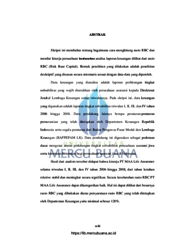 Skripsi ini membahas tentang bagaimana cara menghitung rasio RBC dan menilai kinerja perusahaan berdasarkan analisa laporan keuangan dilihat dari rasio RBC (Risk Base Capital). Bentuk penelitian yang dilakukan adalah penelitian deskriptif yang disusun secara sistematis sesuai dengan data-data yang diperoleh. Data keuangan yang dianalisa adalah laporan perhitungan tingkat solvabilitas yang wajib diserahkan oleh perusahaan asuransi kepada Direktorat Jendral Lembaga Keuangan setiap triwulannya. Pada skripsi ini, data keuangan yang digunakan adalah laporan tingkat solvabilitas triwulan I, II, III, dan IV tahun 2006 hingga 2008. Data pendukung lainnya berupa peraturan-peraturan persuransian yang telah ditetapkan oleh Departemen Keuangan Republik Indonesia serta segala peraturan dari Badan Pengawas Pasar Modal dan Lembaga Keuangan (BAPPEPAM LK). Data pendukung ini digunakan sebagai pedoman dasar mengenai aturan perhitungan tingkat solvabilitas perusahaan asuransi jiwa serta ketentuan-ketentuan bagi perusahaan asuransi jiwa di Indonesia. Hasil dari analisis tersebut didapat bahwa kinerja PT MAA Life Assurance selama triwulan I, II, III, dan IV tahun 2006 hingga 2008, dari tahun ketahun relative stabil dan meningkat secara signifikan. Secara keseluruhan rasio RBC PT MAA Life Assurance dapat dikategorikan baik. Hal ini dapat dilihat dari besarnya rasio RBC yang dibukukan diatas persyarataan rasio RBC yang telah ditetapkan oleh Departeman Keuangan yaitu minimal sebesar 120%.