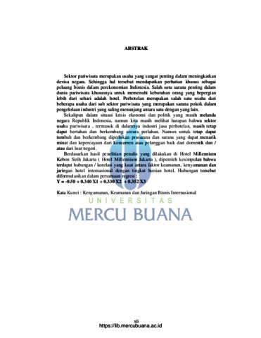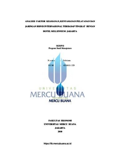 Selviana, Selviana (2010) ANALISIS AKTOR KEAMANAN, KENYAMANAN PELAYANAN DAN JARINGAN BISNIS INTERNASIONAL TERHADAP TINGKAT HUNIAN HOTEL MILENNIUM JAKARTA. S1 thesis, Universitas Mercu Buana.