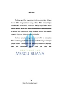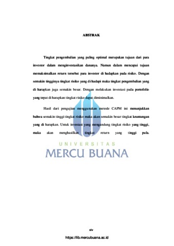 Tingkat pengembalian yang paling optimal merupakan tujuan dari para investor dalam menginvestasikan dananya. Namun dalam mencapai tujuan memaksimalkan return tersebut para investor di hadapkan pada risiko. Dengan semakin tingginya tingkat risiko yang di hadapi maka tingkat pengembalian yang di harapkan juga semakin besar. Dengan melakukan investasi pada portofolio yang tepat di harapkan tingkat risiko dapat diminimalkan. Hasil dari pengujian menggunakan metode CAPM ini menunjukkan bahwa semakin tinggi tingkat risiko maka akan semakin besar tingkat keuntungan yang di harapkan. Untuk investasi yang mengandung tingkat risiko yang tinggi, maka akan menghasilkan tingkat return yang tinggi pula.