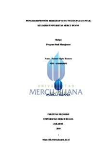 Romero, Samuel Alpha (2010) PENGARUH PROMOSI TERHADAP MINAT MASYARAKAT UNTUK KULIAH DI UNIVERSITAS MERCU BUANA. S1 thesis, Universitas Mercu Buana.