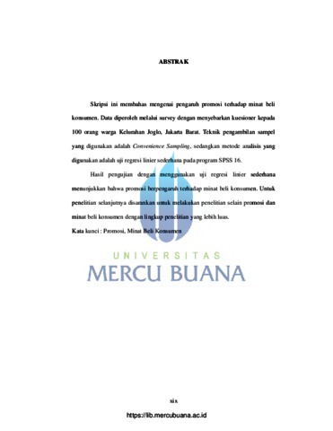 Skripsi ini membahas mengenai pengaruh promosi terhadap minat beli konsumen. Data diperoleh melalui survey dengan menyebarkan kuesioner kepada 100 orang warga Kelurahan Joglo, Jakarta Barat. Teknik pengambilan sampel yang digunakan adalah Convenience Sampling, sedangkan metode analisis yang digunakan adalah uji regresi linier sederhana pada program SPSS 16. Hasil pengujian dengan menggunakan uji regresi linier sederhana menunjukkan bahwa promosi berpengaruh terhadap minat beli konsumen. Untuk penelitian selanjutnya disarankan untuk melakukan penelitian selain promosi dan minat beli konsumen dengan lingkup penelitian yang lebih luas. Kata kunci : Promosi, Minat Beli Konsumen