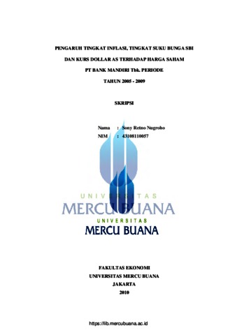 Nugroho, Sony Retno (2010) PENGARUH TINGKAT INFLASI , TINGKAT SUKU BUNGA SBI DAN KURS DOLLAR AS TERHADAP HARGA SAHAM PT. BANK MANDIRI TBK. PERIODE TAHUN 2005 - 2009. S1 thesis, Universitas Mercu Buana.