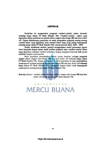 Penelitian ini menganalisis pengaruh variabel-variabel makro ekonomi terhadap harga saham PT Bank Mandiri Tbk. Variabel-variabel makro yang digunakan dalam penelitian ini adalah inflasi, tingkat suku bunga SBI dan kurs dollar AS. Tujuan dilakukannya penelitian ini untuk mengetahui pengaruh masing-masing variabel bebas yang digunakan serta variabel bebas mana yang paling berpengaruh terhadap harga saham PT Bank Mandiri Tbk. selama periode tahun 2005 – 2009. Dalam melakukan analisis, peneliti menggunakan model persamaan regresi linier berganda dengan tujuan untuk melihat pengaruh antar variabel-variabel bebas yang digunakan terhadap variabel terikatnya, dengan pengujian hipotesis baik secara simultan maupun secara parsial. Hasil penelitian menunjukkan bahwa secara simultan terdapat pengaruh tingkat inflasi, tingkat suku bunga SBI dan kurs dollar AS terhadap harga saham PT Bank Mandiri Tbk. dengan α sebesar 5%. Hasil penelitian ini juga menunjukkan secara parsial terdapat pengaruh tingkat suku bunga SBI dan kurs dollar AS terhadap harga saham PT Bank Mandiri Tbk. sedangkan tingkat inflasi tidak berpengaruh secara parsial terhadap harga saham PT Bank Mandiri Tbk. Kata-kata Kunci : variabel makro ekonomi, inflasi, tingkat suku bunga SBI dan kurs dollar AS dan harga saham PT Bank Mandiri Tbk.