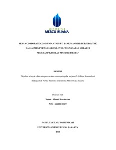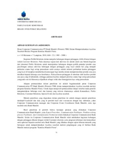 KURNIAWAN, AHMAD (2010) PERAN CORPORATE COMMUNICATION PT. BANK MANDIRI (PERSERO) TBK DALAM MEMPERTAHANKAN LOYALITAS NASABAH MELALUI PROGRAM “KEMILAU MANDIRI FIESTA”. S1 thesis, Universitas Mercu Buana Jakarta.