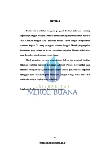 Skripsi ini membahas mengenai pengaruh kualitas pelayanan terhadap kepuasan pelanggan Alfamart. Penulis membatasi lingkup permasalahan hanya di toko Alfamart Jonggol. Data diperoleh melalui survei dengan menyebarkan kuesioner kepada 50 orang pelanggan Alfamart Jonggol. Metode pengumpulan data sampel yang digunakan adalah convenience sampling. Metode analisis data yang digunakan adalah dengan regresi linear. Hasil pengujian hipotesis menunjukkan bahwa ada pengaruh kualitas pelayanan terhadap kepuasan pelanggan Alfamart. Penulis menyarankan agar penelitian selanjutnya yang sehubungan dengan kualitas pelayanan dan kepuasan pelanggan dapat dilakukan pada perusahaan dengan bidang usaha selain ritel minimarket dengan lingkup yang lebih luas. Kata kunci: kualitas pelayanan, kepuasan pelanggan