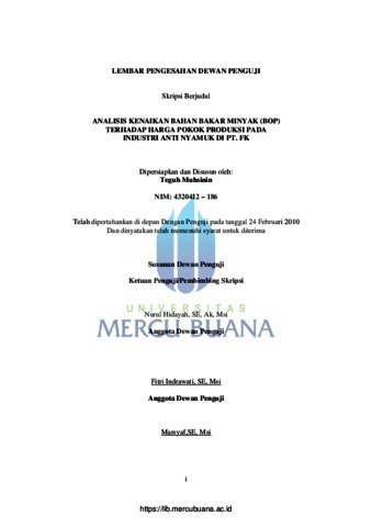 Muhsinin, Teguh (2010) ANALISIS KENAIKAN HARGA BAHAN BAKAR MINYAK (BOP) TERHADAP HARGA POKOK PRODUKSI PADA INDUSTRI OBAT NYAMUK DI PT. FK. S1 thesis, Universitas Mercu Buana.