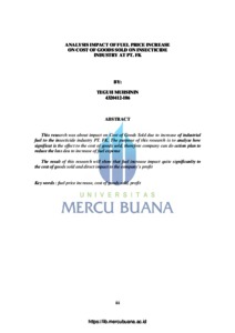This research was about impact on Cost of Goods Sold due to increase of industrial fuel to the insecticide industry PT. FK. The purpose of this research is to analyse how significat is the effect to the cost of goods sold, therefore company can do action plan to reduce the loss deu to increase of fuel expense The result of this research will show that fuel increase impact quite significanlty to the cost of goods sold and direct impact to the company’s profit Key words : fuel price increase, cost of goods sold, profit
