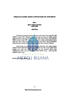 The title given to this research is Audit Reviews of Fixed Assets in PT AIM TRUST, period 2007. The cases of this study are as follows: whether an audit of fixed assets in PT AIM TRUST accordance with auditing theory and SPAP, period 2007. As for the objectives of this study are proving that the audit of fixed assets in accordance with auditing theory and SPAP. Research methods in use are quantitative descriptive and qualitative descriptive methods. The result for the audit of fixed assets by auditors with SPAP reference that audits are conducted on fixed assets accordance with auditing theory and SPA and test result on the transaction of fixed assets is indicated that the data of fixed assets in PT AIM TRUST really exist and the fair has served. Key Word : Audit, Fixed Asset Penelitian ini berjudul tentang Tinjauan Audit Aktiva Tetap pada PT AIM TRUST, periode 2007. Masalah yang dikaji dalam penelitian ini adalah apakah audit atas aktiva tetap pada PT AIM TRUST telah sesuai dengan teori audit dan SPAP, periode tahun 2007. Tujuan penelitian ini adalah membuktikan bahwa audit atas aktiva telah sesuai dengan teori audit dan SPAP. Metode Penelitian yang di gunakan adalah metode deskriptif kuantitatif dan deskriptif kualitatif. Hasil analisa atas audit aktiva tetap yang dilakukan oleh auditor dengan referensi SPAP adalah bahwa audit yang dilakukan atas aktiva tetap sudah sesuai dengan teori audit dan SPAP dan hasil test atas transaksi aktiva tetap menunjukkan bahwa data aktiva tetap PT AIM TRUST benar – benar ada dan sudah di sajikan wajar. Kata Kunci : Audit, Aktiva tetap