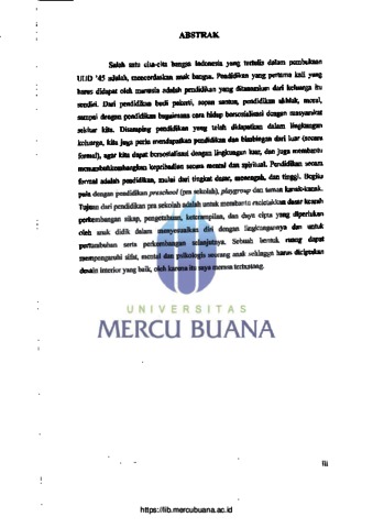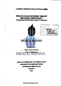 AZWARINI, FINA (2010) PERANCANGAN INTERIOR "BRIGHT BEGINNING PRESCHOOL" (Jl. Elang Raya HF I/15, Bintaro Sektor 9, Tangerang). S1 thesis, Universitas Mercu Buana Jakarta.