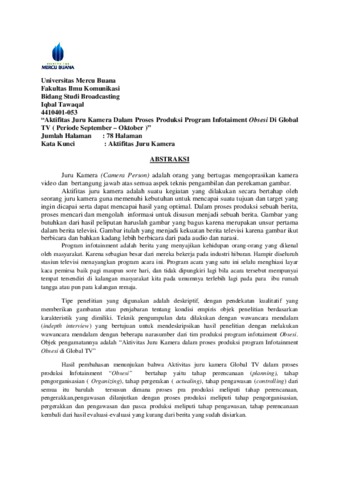 TAWAQAL, IQBAL (2010) AKTIFITAS JURU KAMERA DALAM PROSES PRODUKSI PROGRAM INFOTAINMENT OBSESI DI GLOBAL TV. S1 thesis, Universitas Mercu Buana Jakarta.