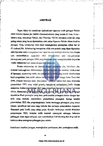 Tugas Akhir ini membahas Optimalisasi kapasitas trafik jaringan Selular GSM (Global System for Mobile Communications) yang berada di Area Timur -Jakarta yang mencakupi Bekasi, dan Cikarang. Hal ini merupkan suatu hal yang paling utama yang harus diperhatikan oleh setiap Operator Selular dalam kualitas jaringan. Yang selanjutnya akan dapat meningkatkan pendapatan dalam hal ini PT.Indosat, Tbk. Rebalancing merupakan salah satu metode yang dapat digunakan oleh Operator untuk mengoptimalkan kapasitas dan meningkatkan kualitas dengan cara menambahkan (upgrade) TRX (Transceiver) atau mengurangkan (downgrade) pada jaringan GSM yang bertujuan untuk mengalokasikan kapasitas Trafik Telekomunikasi sesuai dengan kebutuhan site. Proses rebalancing ini dimulai dengan pendataan site, klasifikasi site, evaluasi kemungkinan dilakukannya rebalancing pada sie tersebut, pelaksanaan di lapangan, monitoring trafik, dan pelaporan ke divisi yang terkait. Berdasarkan hasil pengolahan data trafik selama bulan Oktober 2009 hingga bulan Desember 2009, didapat beberapa hasil, diantaranya pertama bahwa Site yang dilakukan penambahan TRX yang sudah selesai, mengalami peningkatan Trafik dengan sempurna. Kedua penambahan TRX yang mengalami kegagalan terdapat pat beberapa beberapa faktor, diantaranya Konfigurasi Rack penempatan TRX yang terbatas, sehingga MIERCU BUANA diperlukan Rack perangkat yang baru, pada kondisi perangkat Indoor dengan tipe BTS yang berbeda memerlukan penambahan perangkat. Ketiga kondisi penambahan TRX dan pengurangannya, harus menunggu perangkat yang sesuai dengan spesifikasi dari area yang berbeda dan perlunya penamabahan kapasitas Transmisi pada Trafik yang cukup padat. Kondisi berikutnya setelah dilakukan pengurangan TRX, ternyata trafik kembali meningkat sehingga beberapa pelanggan tidak dapat terlayani, dan menimbulkan Call blocking dan drop call ini tentunya akan merugikan pelanggan jasa seluler. Kata kunci: kualitas jaringan, meningkatkan pendapatan, dan peningkatan trafik.