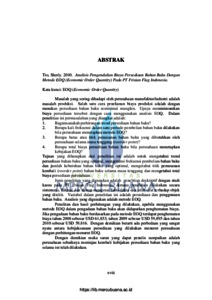 Masalah yang sering dihadapi oleh perusahaan manufaktur/industri adalah masalah produksi. Salah satu cara penekanan biaya produksi adalah dengan menekan persediaan bahan baku seminimal mungkin. Upaya meminimumkan biaya persediaan tersebut dengan cara menggunakan analisis EOQ. Dalam penelitian ini permasalahan yang diangkat adalah: 1. Bagaimanakah perhitungan trend persediaan bahan baku? 2. Berapa kali frekuensi dalam satu periode pembelian bahan baku dilakukan bila perusahaan menetapkan metode EOQ? 3. Berapa batas atau titik pemesanan bahan baku yang dibutuhkan oleh perusahaan selama masa tenggang (reorder point)? 4. Berapa total biaya persediaan bahan baku bila perusahaan menetapkan kebijakan EOQ? Tujuan yang diharapkan dari penelitian ini adalah untuk mengetahui trend persediaan bahan baku yang optimal, mengetahui frekuensi pembelian bahan baku dan jumlah kebutuhan bahan baku yang optimal, mengetahui titik pemesanan kembali (reorder point) bahan baku selama masa tenggang dan mengetahui total biaya persediaan perusahaan. Jenis penelitian yang digunakan adalah penelitian deskriptif dengan studi kasus pada PT Frisian Flag Indonesia, dimana penelitian dilakukan secara sistematis, faktual dan akurat mengenai fakta-fakta dan sifat-sifat terhadap objek yang diteliti. Variabel dalam penelitian ini adalah persediaan dan penggunaan bahan baku. Analisis yang digunakan adalah metode EOQ. Penelitan dan hasil perhitungan yang dilakukan, apabila menggunakan metode EOQ dalam pengadaan bahan baku akan didapatkan penghematan biaya. Jika pengadaan bahan baku berdasarkan pada metode EOQ terdapat penghematan biaya tahun 2008 sebesar USD 61,853; tahun 2009 sebesar USD 59,895 dan tahun 2010 sebesar USD 59,816. Dengan demikian berarti ada perbedaan yang sangat nyata antara kebijaksanaan persediaan yang dilakukan menurut perusahaan dengan perhitungan menurut EOQ. Dengan demikian maka saran yang dapat penulis sampaikan adalah perusahaan sebaiknya meninjau kembali kebijakan persediaan bahan baku yang selama ini telah dilakukan. Kata kunci: EOQ (Economic Order Quantity)