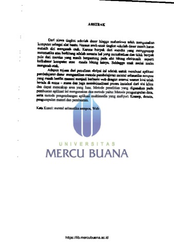 AISAH, SITI (2010) APLIKASI PEMBELAJARAN DASAR MENTAL ARITMATIKA SEMPOA SISTEM 1 - 4 BERBASIS WEB. S1 thesis, Universitas Mercu Buana Jakarta.