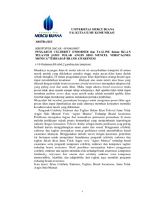 Maraknya tayangan iklan di media televisi ini menyebabkan kompetisi di antara merek produk yang diiklankan semakin tinggi, maka pesan iklan harus diolah sebaik mungkin. Di dalam pengolahan pesan iklan diperlukan strategi kreatif agar dapat menimbulkan kesadaran khalayak atas suatu merek atau biasa yang dikenal dengan istilah brand awareness,brand awareness merupakan tahapan efek yang paling awal dari suatu iklan. Maka, tanpa adanya brand awareness maka pesan tidak akan masuk sampai tahap selanjutnya. Jadi apabila iklan tidak dapat membuat audiens aware akan suatu merek maka adalah mustahil apabila iklan tersebut dapat mendorong audiens melakukan perilaku pembelian. Menyadari hal tersebut, perusahaan berupaya untuk mengemas pesan iklan agar pesan iklan dapat diperhatikan dan pada akhirnya membuat konsumen memiliki kesadaran akan merek yang diiklankan Pengaruh Celebrity Endorser dan Tagline Dalam Iklan Televisi Jamu Tolak Angin Sido Muncul Versi “Agnes Monica” Terhadap Brand Awareness Periklanan merupakan bagian dari komunikasi pemasaran perusahaan di mana melalui periklanan terjadi proses komunikasi yang menjembatani kepentingan industri dengan konsumen. Televisi dinilai sebagai media periklanan yang paling berhasil karena menggabungkan unsur audio dan visual. Penggunaan celebrity endorser dan tagline merupakan strategi periklanan untuk menimbulkan brand awareness khalayak. Menggunakan metode survei dengan kuesioner, penelitian ini bertujuan untuk mengetahui Sejauhmana pengaruh celebrity endorser dan tagline dalam iklan Jamu Tolak Angin versi “Agnes Monica” terhadap brand awareness serta pengaruh komponen celebrity endorser dan komponen tagline terhadap brand awareness. Hasil penelitian menunjukan bahwa penggunaan celebrity endorser dan tagline memiliki efek terhadap brand awareness, komponen familiarity, relevance dan esteem dari celebrity endorser serta komponen memorability, likability dan adaptability dari tagline juga memiliki pengaruh terhadap brand awareness Kata kunci: Iklan, Celebrity Endorser, Tagline, Brand Awareness, Jamu Tolak Angin Sido Muncul
