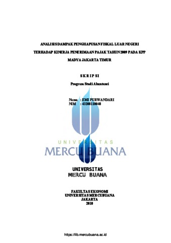 urwandari, Emi (2010) ANALISIS DAMPAK PENGHAPUSAN FISKAL LUAR NEGRI TERHADAP KINERJA PENERIMAAN PAJAK TAHUN 2009 PADA KPP MADYA JAKARTA TIMUR. S1 thesis, Universitas Mercu Buana.
