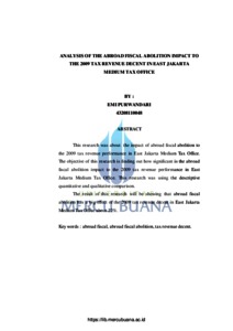 This research was about the impact of abroad fiscal abolition to the 2009 tax revenue performance in East Jakarta Medium Tax Office. The objective of this research is finding out how significant is the abroad fiscal abolition impact to the 2009 tax revenue performance in East Jakarta Medium Tax Office. This research was using the descriptive quantitative and qualitative comparison. The result of this research will be showing that abroad fiscal abolition has a big effect of the 2009 tax revenue decent in East Jakarta Medium Tax Office about 22%. Key words : abroad fiscal, abroad fiscal abolition, tax revenue decent.