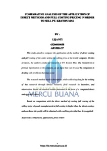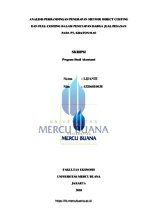Lijanti, Lijanti (2010) ANALISIS PERBANDINGAN PENERAPAN METODE DIRECT COSTING DAN FULL COSTING DALAM PENETAPAN HARGA JUAL PESANAN PADA PT.KRATON MAS. S1 thesis, Universitas Mercu Buana.