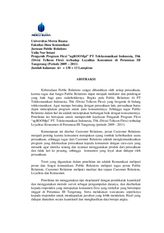 INTANI, YULIA NUR (2010) PENGARUH PROGRAM FLEXI ”ngROOMpi” PT TELEKOMUNIKASI INDONESIA, Tbk (DIVISI TELKOM FLEXI) TERHADAP LOYALITAS KONSUMEN DI PERUMNAS III TANGERANG (PERIODE 2009 – 2011). S1 thesis, Universitas Mercu Buana Jakarta.