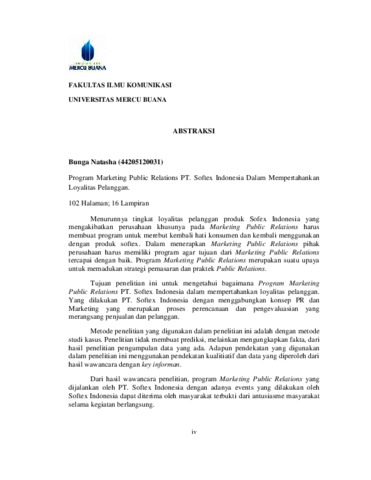 Program Marketing Public Relations PT. Softex Indonesia Dalam Mempertahankan Loyalitas Pelanggan. 102 Halaman; 16 Lampiran Menurunnya tingkat loyalitas pelanggan produk Sofex Indonesia yang mengakibatkan perusahaan khusunya pada Marketing Public Relations harus membuat program untuk merebut kembali hati konsumen dan kembali menggunakan dengan produk softex. Dalam menerapkan Marketing Public Relations pihak perusahaan harus memiliki program agar tujuan dari Marketing Public Relations tercapai dengan baik. Program Marketing Public Relations merupakan suatu upaya untuk memadukan strategi pemasaran dan praktek Public Relations. Tujuan penelitian ini untuk mengetahui bagaimana Program Marketing Public Relations PT. Softex Indonesia dalam mempertahankan loyalitas pelanggan. Yang dilakukan PT. Softex Indonesia dengan menggabungkan konsep PR dan Marketing yang merupakan proses perencanaan dan pengevaluasian yang merangsang penjualan dan pelanggan. Metode penelitian yang digunakan dalam penelitian ini adalah dengan metode studi kasus. Penelitian tidak membuat prediksi, melainkan mengungkapkan fakta, dari hasil penelitian pengumpulan data yang ada. Adapun pendekatan yang digunakan dalam penelitian ini menggunakan pendekatan kualitiatif dan data yang diperoleh dari hasil wawancara dengan key informan. Dari hasil wawancara penelitian, program Marketing Public Relations yang dijalankan oleh PT. Softex Indonesia dengan adanya events yang dilakukan oleh Softex Indonesia dapat diterima oleh masyarakat terbukti dari antusiasme masyarakat selama kegiatan berlangsung.