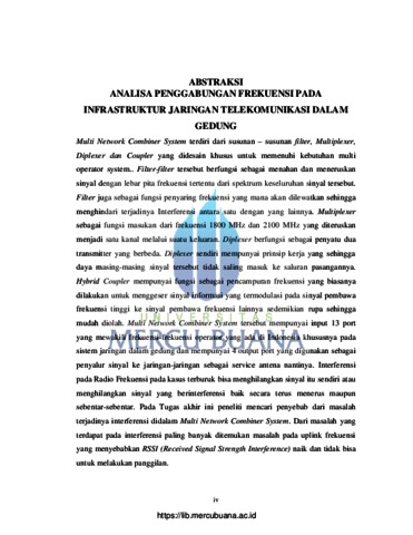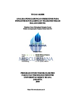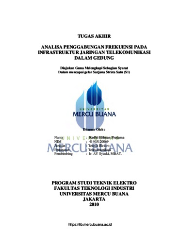Pratama, Radhi Hilman (2010) ANALISA PENGGABUNGAN FREKUENSI PADA INFRASTRUKTUR JARINGAN TELEKOMUNIKASI DALAM GEDUNG. S1 thesis, Universitas Mercu Buana.