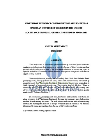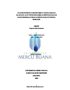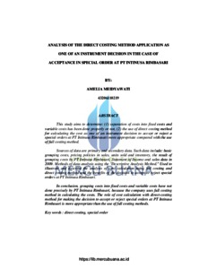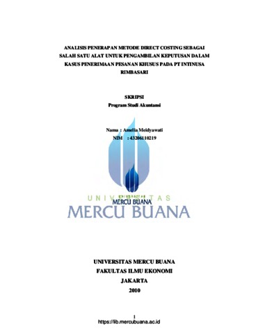 Meidyawati, Amelia (2010) ANALISIS PENERAPAN METODE DIRECT COSTING SEBAGAI SALAH SATU ALAT UNTUK PENGAMBILAN KEPUTUSAN DALAM KASUS PENERIMAAN PESANAN KHUSUS PADA PT INTINUSA RIMBASARI. S1 thesis, Universitas Mercu Buana.