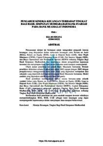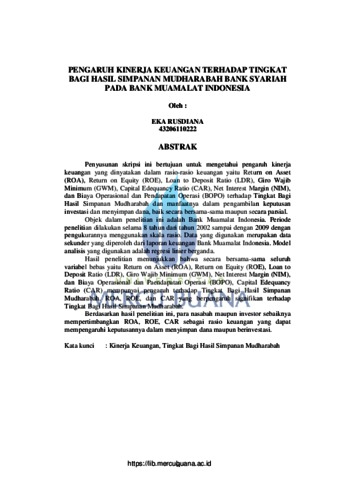 The objective of this thesis is to find out the influence of financial perfomance stated in financial ratios such as Return on Asset (ROA), Return on Equity (ROE), Loan to Deposit Ratio (LDR), Capital Edequancy Ratio (CAR), Giro Wajib Minimum (GWM), Biaya Operasional dan Pendapatan Operasi (BOPO) and Net Interest Margin (NIM) toward Deposit Sharing Holder Level of Mudharabah and its usefullness in the customer and investment decision making in both simultaneously and partially. The object of this research is “Bank Muamalat Indonesia” time period are 8 years from 2002 to 2009 wiyh the measurement or scala ration. Data used is secondary data that have from company financial statement of “Bank Muamalat Indonesia”. The analysis model applied is multiple overall independent. Variables such as Return on Asset (ROA), Return on Equity (ROE), Loan to Deposit Ratio (LDR), Giro Wajib Minimum (GWM), Biaya Operasional dan Pendapatan Operasi (BOPO), Net Interest Margin (NIM), Capital Adequancy Ratio (CAR) have significant influence toward Deposit Sharing Level of Mudharabah. Meanwhile, partially one independent variable is ROA, ROE, CAR that have significant influence toward Deposit Sharing Holder Level of Mudharabah. Based on this result of research, the customer or the candidate of investors should consider ROA, ROE, and CAR as financial ratio that can influencing they decision in saving or investment. Keywords : Financial Performance, Level of Sharing Holder Deposit. Penyusunan skripsi ini bertujuan untuk mengetahui pengaruh kinerja keuangan yang dinyatakan dalam rasio-rasio keuangan yaitu Return on Asset (ROA), Return on Equity (ROE), Loan to Deposit Ratio (LDR), Giro Wajib Minimum (GWM), Capital Edequancy Ratio (CAR), Net Interest Margin (NIM), dan Biaya Operasional dan Pendapatan Operasi (BOPO) terhadap Tingkat Bagi Hasil Simpanan Mudharabah dan manfaatnya dalam pengambilan keputusan investasi dan menyimpan dana, baik secara bersama-sama maupun secara parsial. Objek dalam penelitian ini adalah Bank Muamalat Indonesia. Periode penelitian dilakukan selama 8 tahun dari tahun 2002 sampai dengan 2009 dengan pengukurannya menggunakan skala rasio. Data yang digunakan merupakan data sekunder yang diperoleh dari laporan keuangan Bank Muamalat Indonesia. Model analisis yang digunakan adalah regresi linier berganda. Hasil penelitian menunjukkan bahwa secara bersama-sama seluruh variabel bebas yaitu Return on Asset (ROA), Return on Equity (ROE), Loan to Deposit Ratio (LDR), Giro Wajib Minimum (GWM), Net Interest Margin (NIM), dan Biaya Operasional dan Paendapatan Operasi (BOPO), Capital Edequancy Ratio (CAR) mempunyai pengaruh terhadap Tingkat Bagi Hasil Simpanan Mudharabah. ROA, ROE, dan CAR yang berpengaruh signifikan terhadap Tingkat Bagi Hasil Simpanan Mudharabah. Berdasarkan hasil penelitian ini, para nasabah maupun investor sebaiknya mempertimbangkan ROA, ROE, CAR sebagai rasio keuangan yang dapat mempengaruhi keputusannya dalam menyimpan dana maupun berinvestasi. Kata kunci : Kinerja Keuangan, Tingkat Bagi Hasil Simpanan Mudharabah