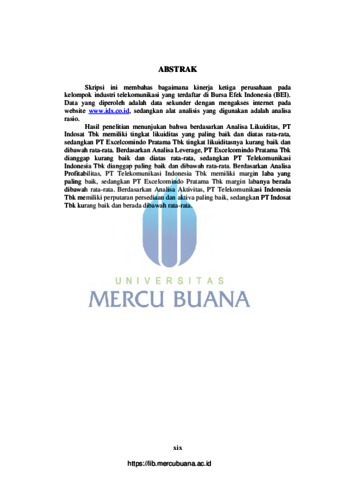 Skripsi ini membahas bagaimana kinerja ketiga perusahaan pada kelompok industri telekomunikasi yang terdaftar di Bursa Efek Indonesia (BEI). Data yang diperoleh adalah data sekunder dengan mengakses internet pada website www.idx.co.id, sedangkan alat analisis yang digunakan adalah analisa rasio. Hasil penelitian menunjukan bahwa berdasarkan Analisa Likuiditas, PT Indosat Tbk memiliki tingkat likuiditas yang paling baik dan diatas rata-rata, sedangkan PT Excelcomindo Pratama Tbk tingkat likuiditasnya kurang baik dan dibawah rata-rata. Berdasarkan Analisa Leverage, PT Excelcomindo Pratama Tbk dianggap kurang baik dan diatas rata-rata, sedangkan PT Telekomunikasi Indonesia Tbk dianggap paling baik dan dibawah rata-rata. Berdasarkan Analisa Profitabilitas, PT Telekomunikasi Indonesia Tbk memiliki margin laba yang paling baik, sedangkan PT Excelcomindo Pratama Tbk margin labanya berada dibawah rata-rata. Berdasarkan Analisa Aktivitas, PT Telekomunikasi Indonesia Tbk memiliki perputaran persediaan dan aktiva paling baik, sedangkan PT Indosat Tbk kurang baik dan berada dibawah rata-rata