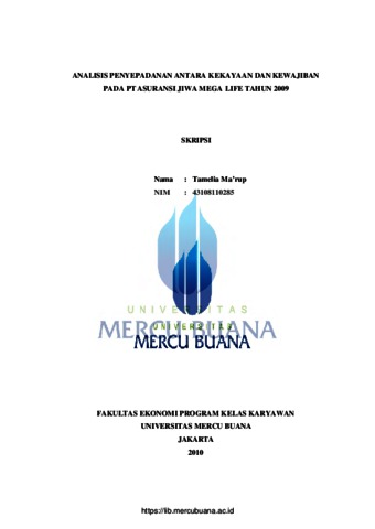 Ma'rup, Tamelia (2010) ANALISIS PENYEPADANAN ANTARA KEKAYAAN DAN KEWAJIBAN PADA PT. ASURANSI JIWA MEGA LIFE TAHUN 2009. S1 thesis, Universitas Mercu Buana.
