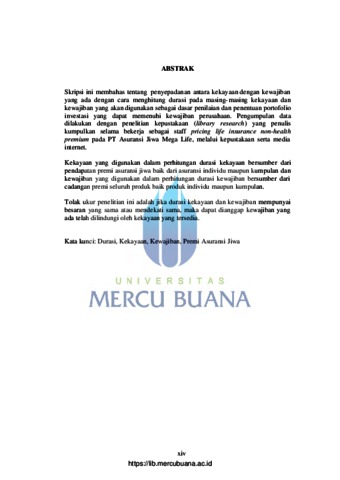 Skripsi ini membahas tentang penyepadanan antara kekayaan dengan kewajiban yang ada dengan cara menghitung durasi pada masing-masing kekayaan dan kewajiban yang akan digunakan sebagai dasar penilaian dan penentuan portofolio investasi yang dapat memenuhi kewajiban perusahaan. Pengumpulan data dilakukan dengan penelitian kepustakaan (library research) yang penulis kumpulkan selama bekerja sebagai staff pricing life insurance non-health premium pada PT Asuransi Jiwa Mega Life, melalui kepustakaan serta media internet. Kekayaan yang digunakan dalam perhitungan durasi kekayaan bersumber dari pendapatan premi asuransi jiwa baik dari asuransi individu maupun kumpulan dan kewajiban yang digunakan dalam perhitungan durasi kewajiban bersumber dari cadangan premi seluruh produk baik produk individu maupun kumpulan. Tolak ukur penelitian ini adalah jika durasi kekayaan dan kewajiban mempunyai besaran yang sama atau mendekati sama, maka dapat dianggap kewajiban yang ada telah dilindungi oleh kekayaan yang tersedia. Kata kunci: Durasi, Kekayaan, Kewajiban, Premi Asuransi Jiwa