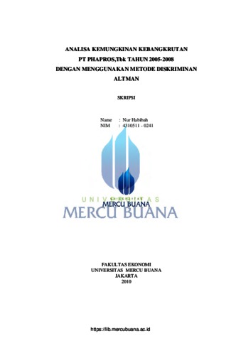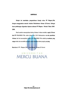 Habibah, Nur (2010) ANALISA KEMUNGKINAN KEBANGKRUTAN PT. PHAPROS TAHUN 2005-2008 DENGAN MENGGUNAKAN METODE DISKRIMINAN ALTMAN. S1 thesis, Universitas Mercu Buana.