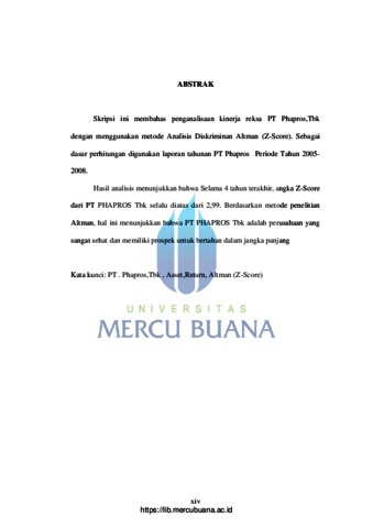 Skripsi ini membahas penganalisaan kinerja reksa PT Phapros,Tbk dengan menggunakan metode Analisis Diskriminan Altman (Z-Score). Sebagai dasar perhitungan digunakan laporan tahunan PT Phapros Periode Tahun 2005- 2008. Hasil analisis menunjukkan bahwa Selama 4 tahun terakhir, angka Z-Score dari PT PHAPROS Tbk selalu diatas dari 2,99. Berdasarkan metode penelitian Altman, hal ini menunjukkan bahwa PT PHAPROS Tbk adalah perusahaan yang sangat sehat dan memiliki prospek untuk bertahan dalam jangka panjang Kata kunci: PT . Phapros,Tbk , Asset,Return, Altman (Z-Score)