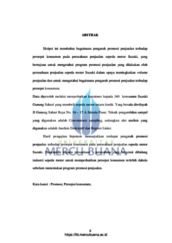Skripsi ini membahas bagaimana pengaruh promosi penjualan terhadap persepsi konsumen pada perusahaan penjualan sepeda motor Suzuki, yang bertujuan untuk mengetahui program promosi penjualan yang dilakukan oleh perusahaan penjualan sepeda motor Suzuki dalam upaya meningkatkan volume penjualan dan untuk mengetahui bagaimana pengaruh promosi penjualan terhadap persepsi konsumen. Data diperoleh melalui menyerbarkan kuesioner kepada 160 konsumen Suzuki Gunung Sahari yang membeli sepeda motor secara kredit. Yang berada diwilayah Jl Gunung Sahari Raya No. 16 – 17 A Jakarta Pusat. Teknik pengambilan sampel yang digunakan adalah Convenience sampling, sedangkan alat analisis yang digunakan adalah Analisis Deskriptif dan Regresi Linier. Hasil pengujian hipotesis menunjukkan terdapat pengaruh promosi penjualan terhadap persepsi konsumen pada perusahaan penjualan sepeda motor Suzuki. Disarankan kepada perusahaan – perusahaan yang bergerak dibidang industri sepeda motor untuk memperhatikan persepsi konsumen terlebih dahulu sebelum menentukan program promosi penjualan. Kata kunci : Promosi, Persepsi konsumen,