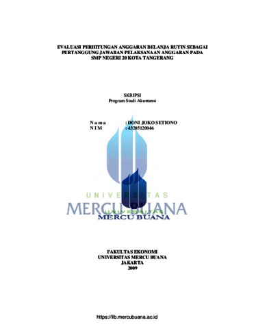 Setiono, Doni Joko (2010) EVALUASI PERHITUNGAN ANGGARAN BELANJA RUTIN SEBAGAI PERTANGGUNGJAWABAN PELAKSANAAN ANGGARAN PADA SMP NEGERI 20 KOTA TANGERANG. S1 thesis, Universitas Mercu Buana.