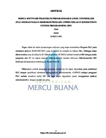This graduate thesis contain about designing software that can write the PLC program at Bascom mediator application in 8051 which later compiled into the language Hex. That can be converted or insert into AT 89S52 Microcontroller IC through ISP connector for charging the media from the PC to the memory microcontroller via ISP microcontroller software. This software runs parallel port connected to a PC It is expected that after testing the program, this module can be used on PLC lab with the minimum specifications using AT89S52 microcontroller instead of the PLC through an ISP cable and connector can also be used to teach microcontroller applications easily and clearly. Tugas Akhir ini berisi perancangan software yang dapat menuliskan Program PLC pada mediaator aplikasi BASCOM 8051 yang kemudian di compile ke bahasa Hex. Sehingga dapat dikonversikan atau di isikan ke IC Mikrokontroler AT 89S52 melalui konektor ISP sebagai media pengisian dari PC ke dalam memori Mikrokontroller melalui Software Mikrokontroller ISP. Software ini dijalankan terhubung ke Paralel Port PC. Diharapkan setelah pengujian program, modul ini ini dapat digunakan pada praktikum PLC dengan spesifikasi minimum menggunakan mikrokontroler AT89S52 sebagai pengganti PLC melalui konektor kabel ISP dan juga dapat digunakan untuk mengajarkan aplikasi mikrokontroller dengan mudah dan jelas.
