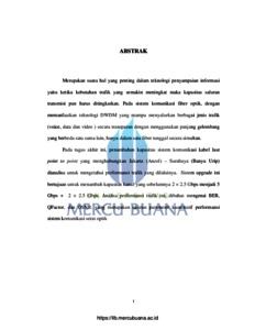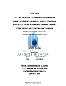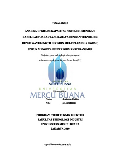 Hakim, Lukman (2010) ANALISA UPGRADE KAPASITAS SISTEM KOMUNIKASI KABEL LAUT JAKARTA-SURABAYA DENGAN TEKNOLOGI DENSE WAVELENGTH DIVISION MULTIPLEXING ( DWDM ) UNTUK MENGETAHUI PERFORMANSI TRANSMISI. S1 thesis, Universitas Mercu Buana.