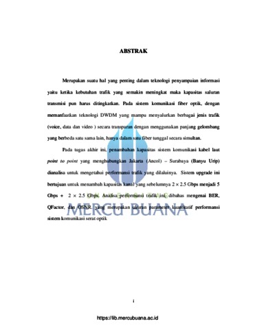 Merupakan suatu hal yang penting dalam teknologi penyampaian informasi yaitu ketika kebutuhan trafik yang semakin meningkat maka kapasitas saluran transmisi pun harus ditingkatkan. Pada sistem komunikasi fiber optik, dengan memanfaatkan teknologi DWDM yang mampu menyalurkan berbagai jenis trafik (voice, data dan video ) secara transparan dengan menggunakan panjang gelombang yang berbeda satu sama lain, hanya dalam satu fiber tunggal secara simultan. Pada tugas akhir ini, penambahan kapasitas sistem komunikasi kabel laut point to point yang menghubungkan Jakarta (Ancol) – Surabaya (Banyu Urip) dianalisa untuk mengetahui performansi trafik yang dilaluinya. Sistem upgrade ini bertujuan untuk menambah kapasitas kanal yang sebelumnya 2 × 2.5 Gbps menjadi 5 Gbps + 2 × 2.5 Gbps. Analisa performansi trafik ini, dibahas mengenai BER, QFactor, dan OSNR. yang merupakan ukuran parameter kuantitatif performansi sistem komunikasi serat optik