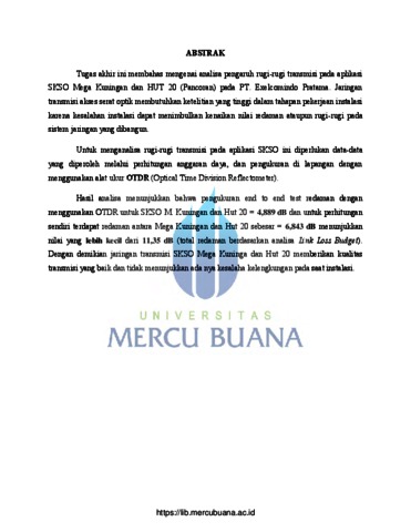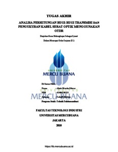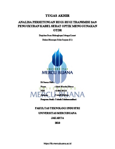 Edwar, Alwis Martin (2010) ANALISA PERHITUNGAN RUGI-RUGI TRANSMISI DAN PENGUKURAN KABEL SERAT OPTIK MENGGUNAKAN OTDR. S1 thesis, Universitas Mercu Buana.