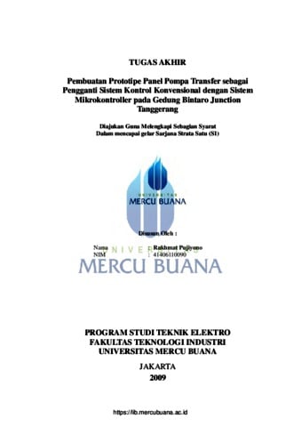 Pujiyono, Rakhmat (2010) PEMBUATAN PROTOTIPE PANEL POMPA TRASFER SEBAGAI PENGGANTI SISTEM KONTROL KONVENSIONAL DENGAN SISTEM MICROKONTROLLER PADA GEDUNG BINTARO JUNCTION TANGGERANG. S1 thesis, Universitas Mercu Buana.