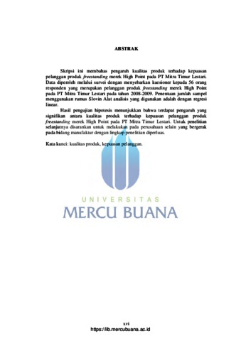 Skripsi ini membahas pengaruh kualitas produk terhadap kepuasan pelanggan produk freestanding merek High Point pada PT Mitra Timur Lestari. Data diperoleh melalui survei dengan menyebarkan kuesioner kepada 56 orang responden yang merupakan pelanggan produk freestanding merek High Point pada PT Mitra Timur Lestari pada tahun 2008-2009. Penentuan jumlah sampel menggunakan rumus Slovin Alat analisis yang digunakan adalah dengan regresi linear. Hasil pengujian hipotesis menunjukkan bahwa terdapat pengaruh yang signifikan antara kualitas produk terhadap kepuasan pelanggan produk freestanding merek High Point pada PT Mitra Timur Lestari. Untuk penelitian selanjutnya disarankan untuk melakukan pada perusahaan selain yang bergerak pada bidang manufaktur dengan lingkup penelitian diperluas. Kata kunci: kualitas produk, kepuasan pelanggan.