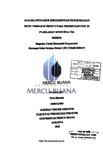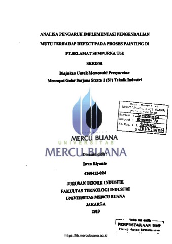RIYANTO, IWAN (2010) ANALISA PENGARUH IMPLEMENTASI PENGENDALIAN MUTU TERHADAP DEFECT PADA PROSES PAINTING DI PT. SELAMAT SEMPURNA TBK. S1 thesis, Universitas Mercu Buana Jakarta.