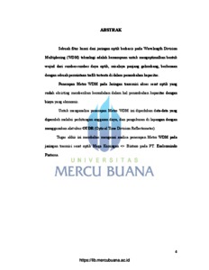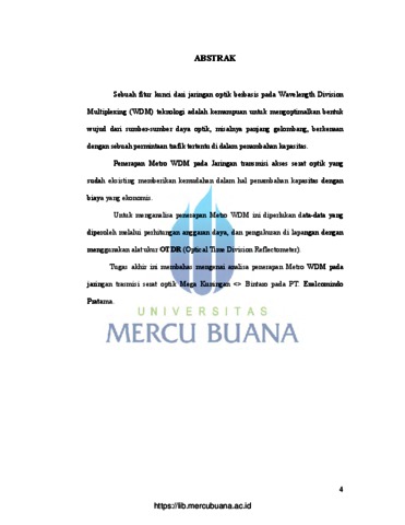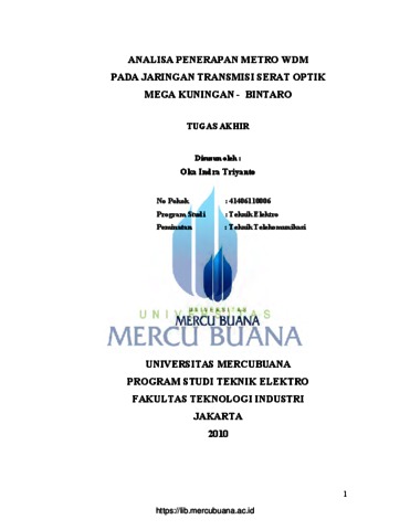 Triyanto, Oka Indra (2010) ANALISA PENERAPAN METRO WDM PADA JARINGAN TRANSMISI SERAT OPTIK MEGA KUNINGAN - BINTARO. S1 thesis, Universitas Mercu Buana.